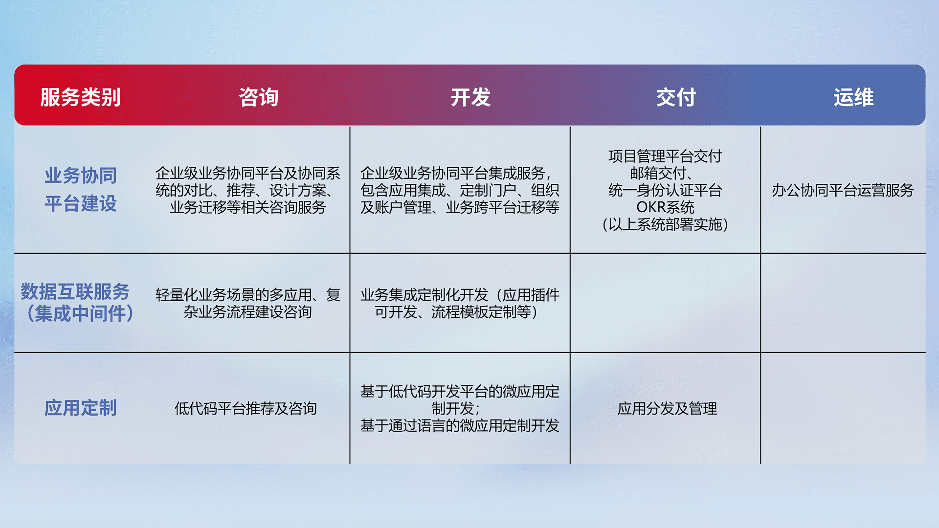 针对钉钉、、企微、、IDaas等平台级产品提供产品的规划、、、方案、、交付、、定制化开发等服务,,实现如统一协同办公、、、智能客户服务、、、混合会议管理、、、、智能数据查询、、、、等业务场景,,实现数字化转型。。。